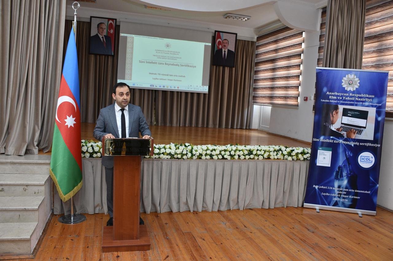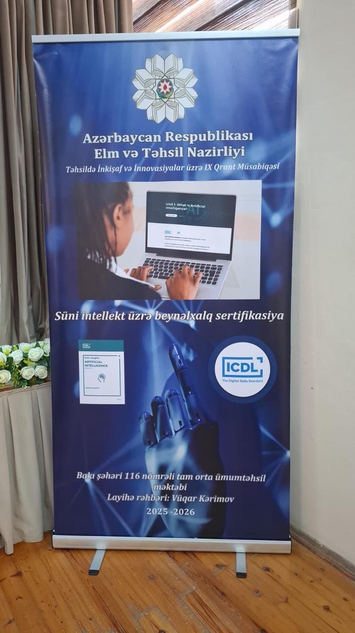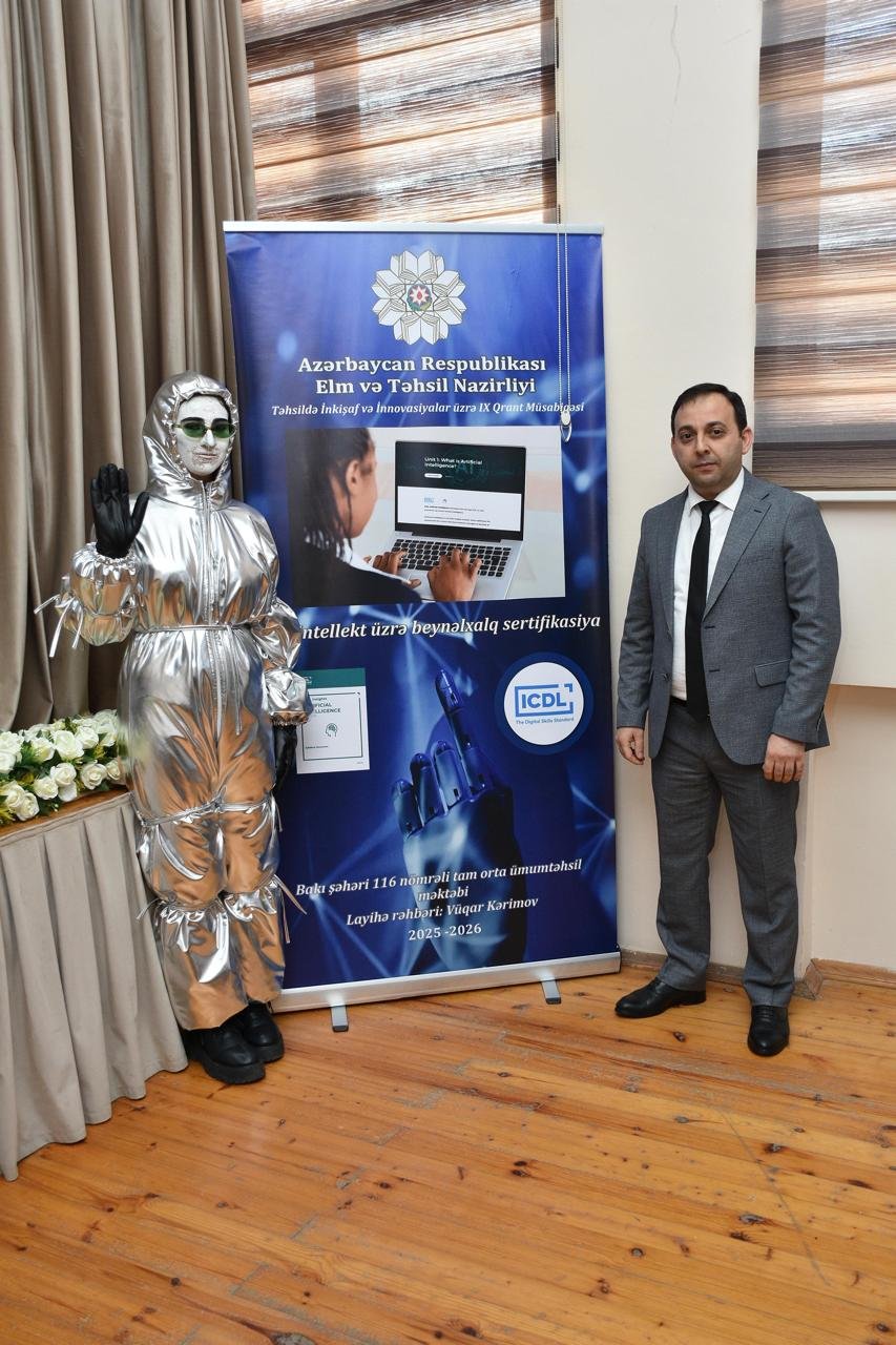 Xatırladırıq ki, “Süni İntellekt üzrə Beynəlxalq Sertifikasiya” qrant layihəsi Təhsildə İnkişaf və İnnovasiyalar üzrə IX Qrant Müsabiqəsinin qalib layihələrindəndir və Vüqar Kərimov tərəfindən Bakı şəhər 116 nömrəli tam orta ümumtəhsil məktəbində həyata keçirilir. Layihənin məqsədi müəllimlərdə süni intellekt alətləri vasitəsilə interaktiv dərs qurma, rəqəmsal məzmun yaratma və tədris prosesini daha effektiv idarəetmə bacarıqlarını inkişaf etdirməkdir.