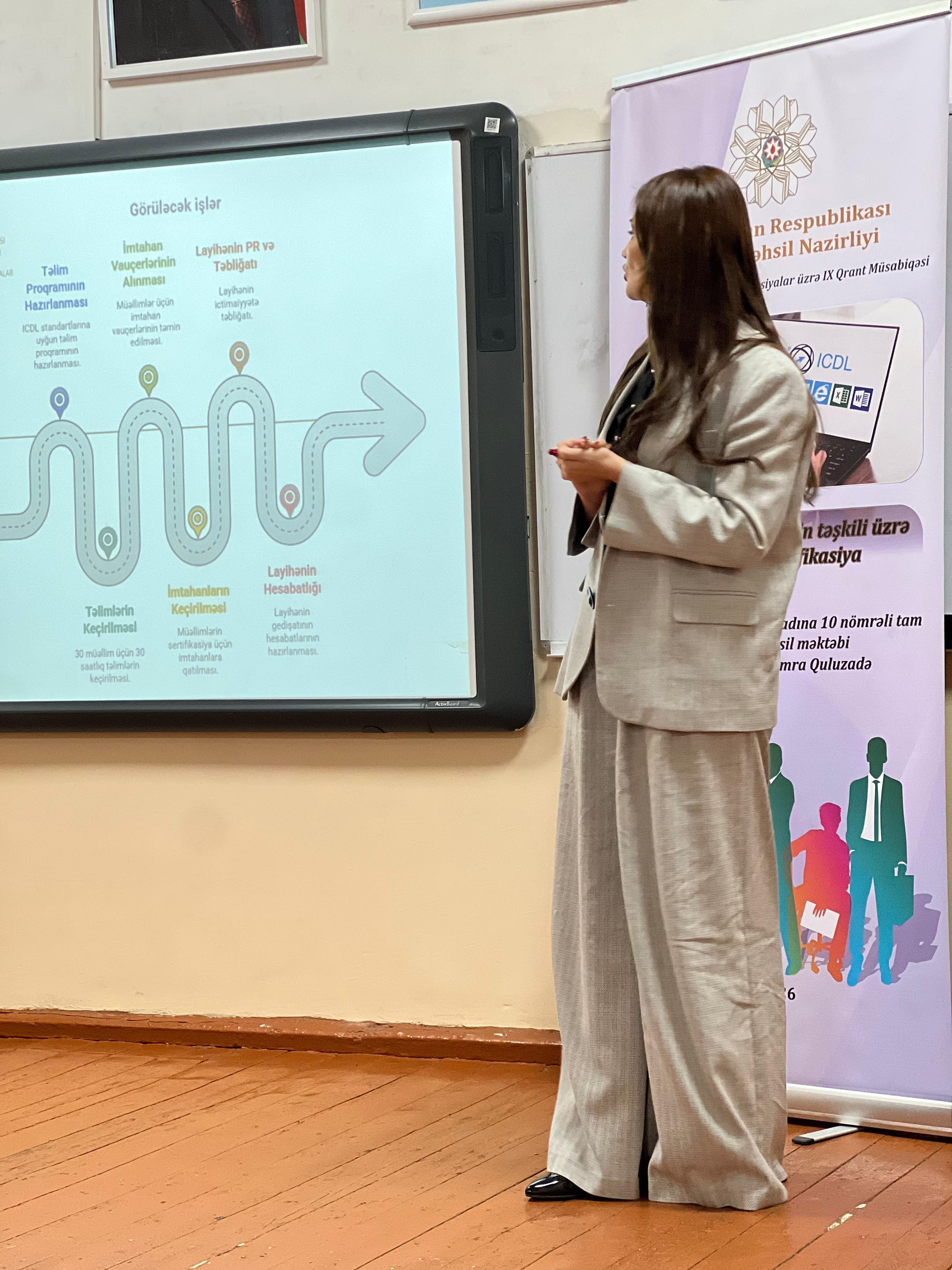 Qeyd edək ki, layihənin məqsədi ümumi təhsil məktəbinin 30 nəfər müəlliminə onlayn komanda işinin təşkili üzrə lazım olan bacarıqları qazandırmaq və onları beynəlxalq “ICDL Workforce Teamwork” sertifikasiyasına hazırlamaqdır. Xatırladaq ki, layihə 6 ay müddətində həyata keçiriləcək. Bu müddət ərzində müəllimlər təlimlərdə iştirak edəcək, daha sonra isə beynəlxalq “ICDL Workforce Teamwork” imtahanına cəlb olunacaq və imtahan nəticələrinə uyğun olaraq beynəlxalq sertifikat əldə edəcəklər. Beynəlxalq sertifikasiya imtahanı Təhsildə İnnovativ Texnologiyalar Əlavə Təhsil Mərkəzində (İTE) yerləşən rəsmi ICDL Authorized Testing Center-də keçiriləcək.